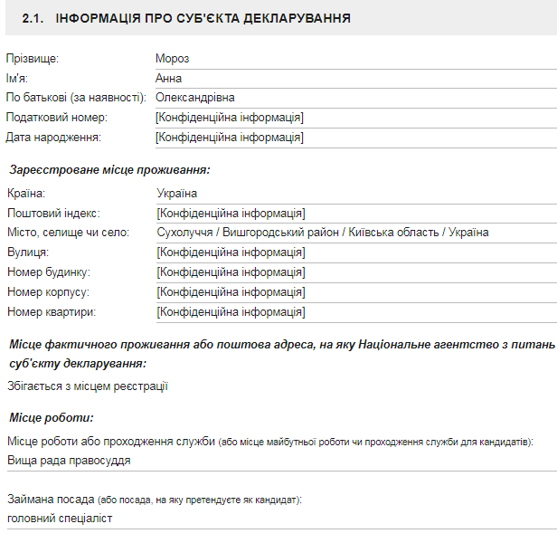 Как сообщал Центр журналистских расследований, Николай Гусак трудоустроил дочь Алексанра Мороза Анну Мороз на работу в ВСП в обход конкурсных процедур. Действительно, согласно поданной декларации, Анна Мороз числится в ВСП главным специалистом со средней зарплатой больше 20 тыс. грн в месяц: