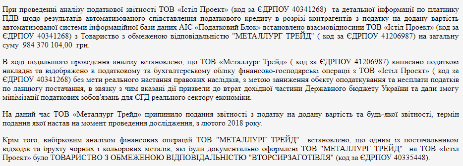 В частности, как указано в одном из определений Печерского райсуда Киева, ООО "ИСТИЛ ПРОЕКТ" поучаствовало в фиктивных операциях с целью занижения налогов на сумму почти миллиард (!) гривен: