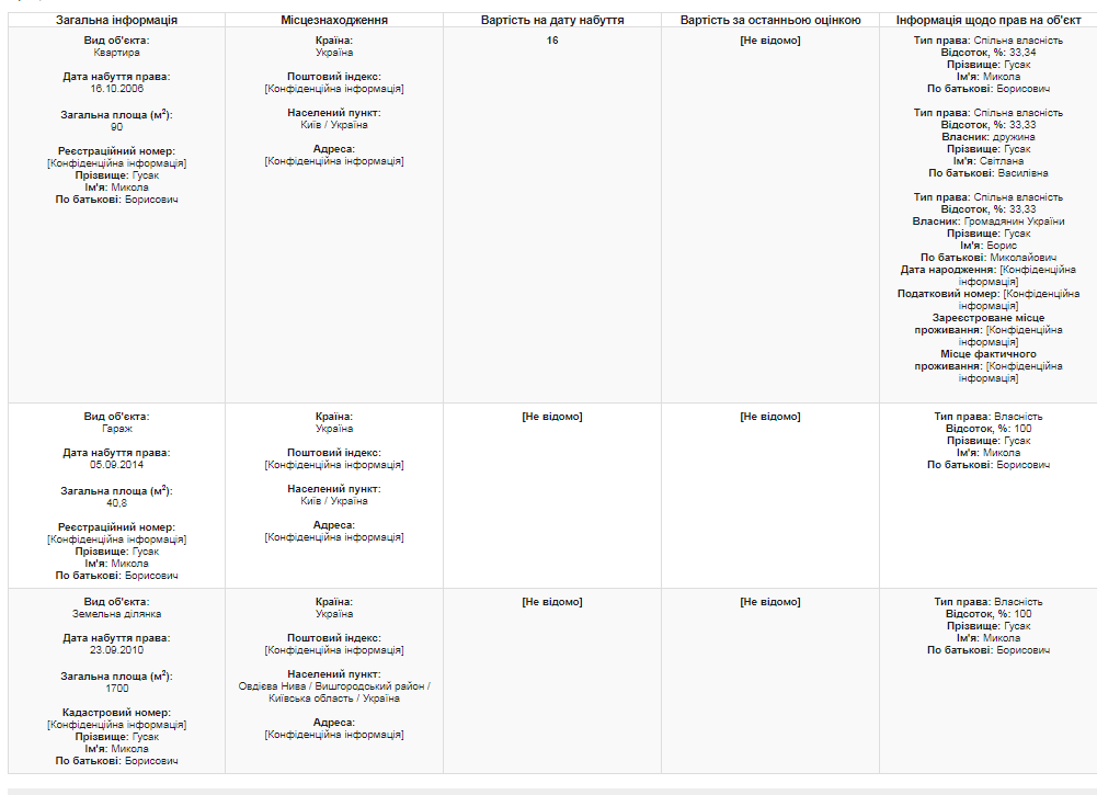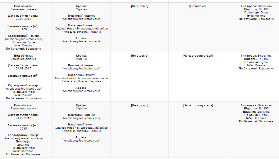 Кроме гаража и квартиры в Киеве, Николай Гусак задекларировал в 2017 году три земельных участка в родном селе Овдиева Нива. Два из них записаны на самого Николая Гусака, а еще один – на жену Светлану Гусак: