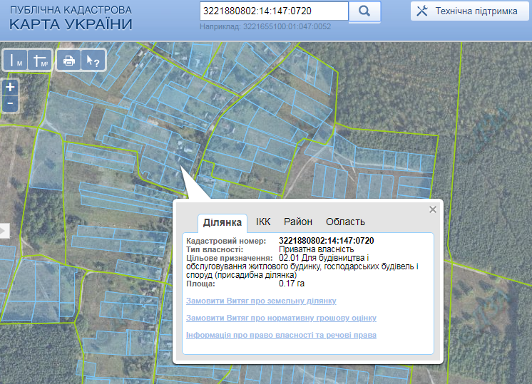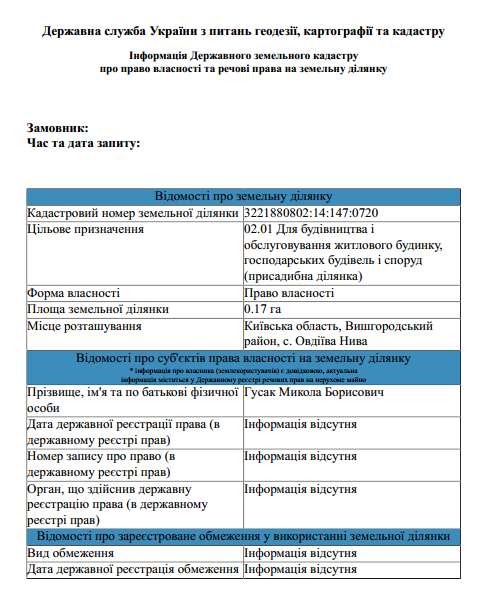 Например, согласно данным земельного кадастра, земельный участок площадью 17 соток, который задекларировал Николай Гусак, имеет кадастровый номер 3221880802:14:147:0720: