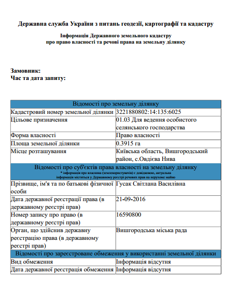 Что касается участка 39 соток, который не попал в декларацию 2016 года, то, согласно данным земельного кадастра, он действительно был оформлен на жену Николая Гусака в сентябре 2016 года: