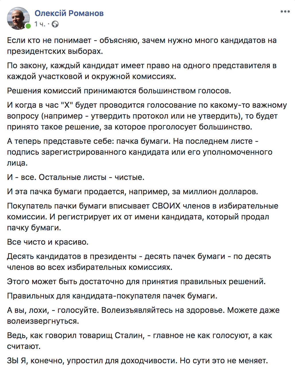 “Как оказалось, сумма 2 с половиной миллиона гривен - слишком мала, но повышать ее невозможно. Вариант сбора подписей избирателей отпадает: уже пробовали - проверить даже 100 тысяч подписей за 40 кандидатов в течение недели просто невозможно. Всё равно будут фальсификации. Как вариант можно рассмотреть идеи подписей действующих депутатов Верховной Рады и местных советов в поддержку кандидата. Например, 20 депутатов парламента и 500 - местных советов. Если кандидат солидный, то он будет иметь или поддержку развитой партийной структуры или сможет сагитировать в свою поддержку 520 политически грамотных людей”, - предлагает Попов.