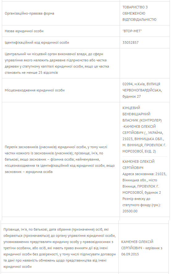 А вот в данных реестра насчет ООО "Втор-мет", где Алексей Каменев и учредитель, и директор, местом его жительства указана уже Винница, но точно в том же доме по тому же переулку Г.Морозовой: