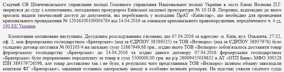 Например, Алексей Каменев числится директором и учредителем киевского ООО "Велкорм". В определении Шевченковского райсуда столицы в рамках уголовного производства по делу о мошенничестве в особо крупных размерах говорится, что,по версии следствия, фермерское хозяйство перечислило этой фирме 5,5 млн. грн. за удобрения, но товар поставлен не был. В результате представители ООО "Велкорм" якобы путем обмана завладели средствами фермеров, нанеся им материальный ущерб в особо крупных размерах: