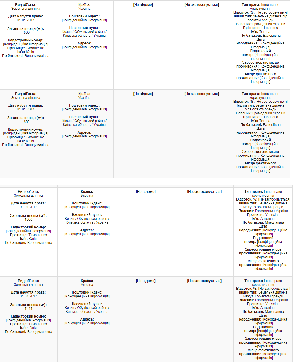 Еще на тетю с ее мужем записаны пять участков в Киеве площадью 46 соток, три в Днепре в 21,9 сотки, и еще два в Козине – возле дома, в котором живет Юлия Тимошенко, о которых мы уже упоминали.