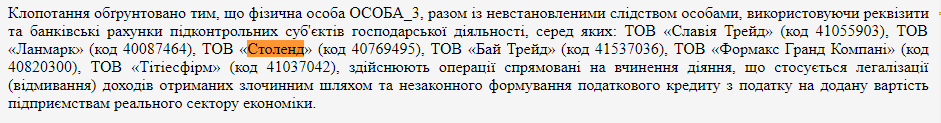 Например, в определении Святошинского райсуда столицы указано, что ООО "Столенд", по версии следствия, входит в "пул" фирм, которые проводят операции, направленные на легализацию (отмывание) доходов, полученных преступным путем, и незаконное формирование налогового кредита по НДС: