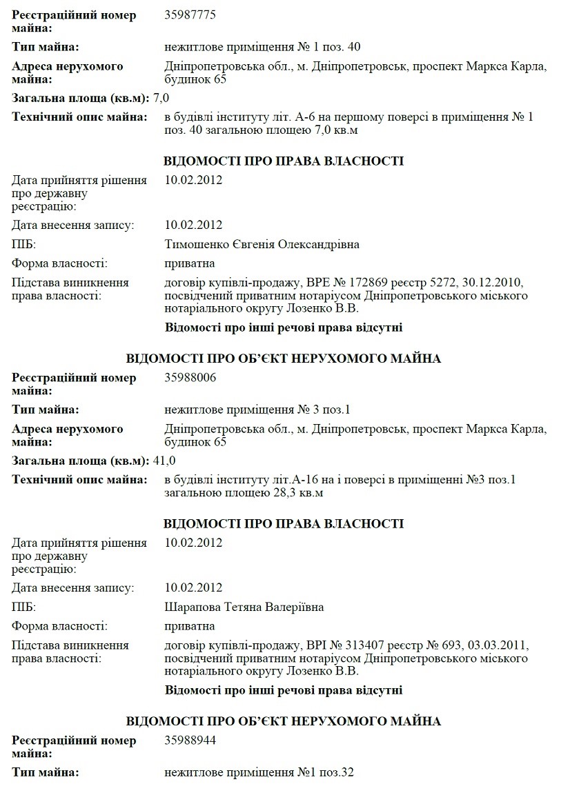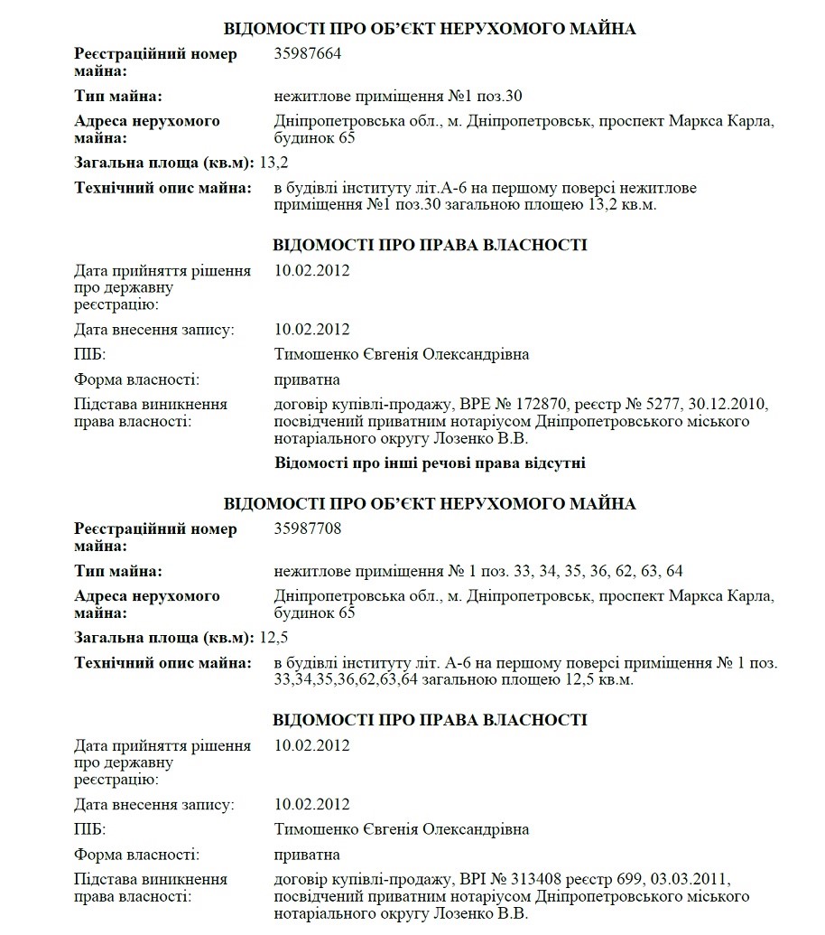 Еще семье Тимошенко принадлежит почти все 6-этажное здание в самом центре Днепра, на проспекте Яворницкого (бывший Карла Маркса), 65. Помещения были выкуплены еще в 2000 году у государственного НИИ механизации труда в черной металлургии.