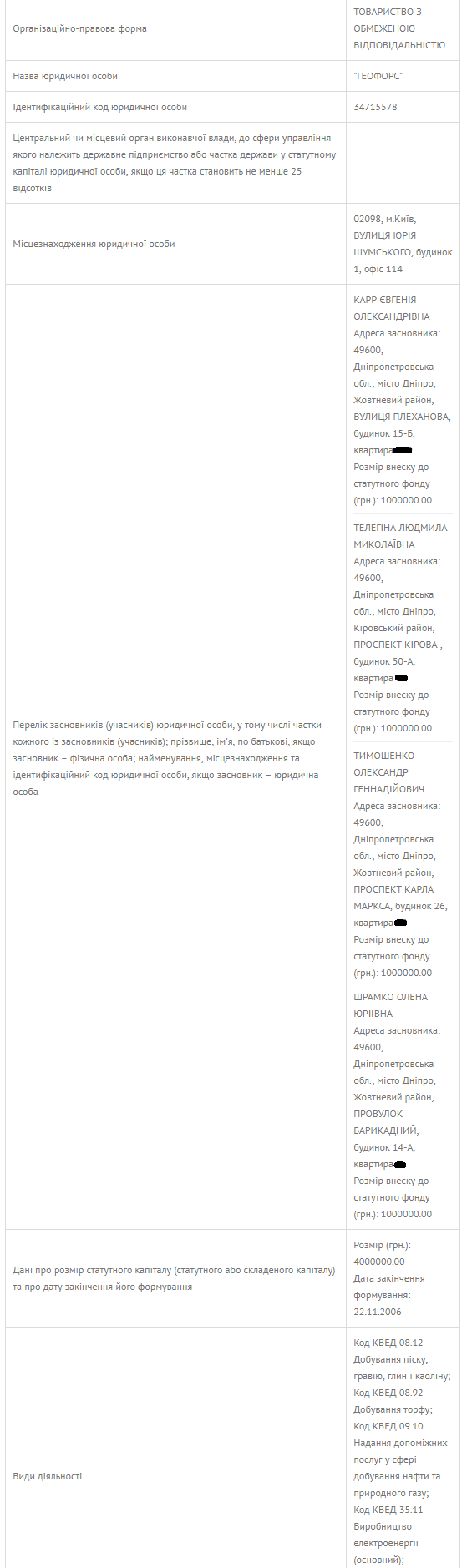 В "Геофорсе", согласно данным реестра юридических лиц, по 25 % еще имеют Евгения Карр (дочь Юлии Тимошенко) и мать политика Людмила Телегина. То есть, это практически полностью семейная компания. Еще четверть фирмы записаны на Елену Шрамко – так зовут одного нотариуса из Днепропетровска: