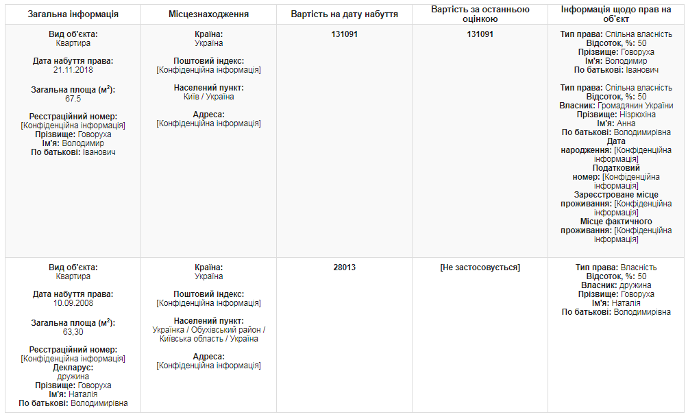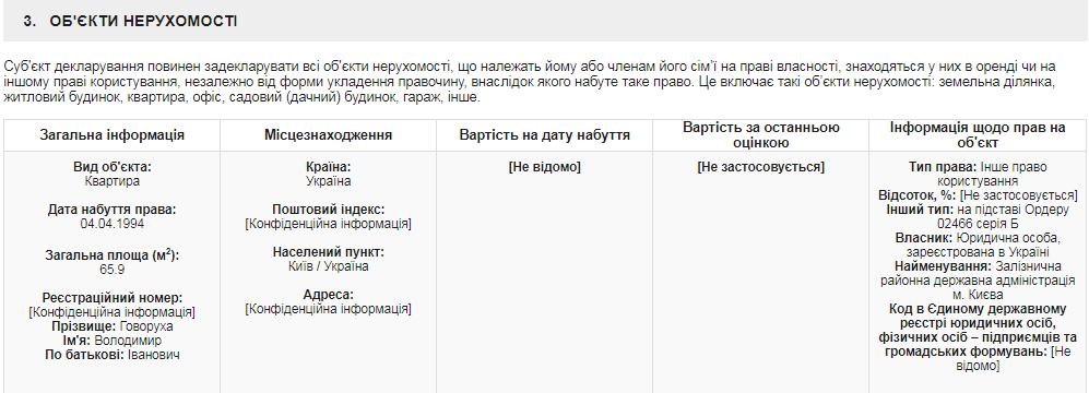 В принципе, такой вариант возможен в случае приватизации жилья. В декларации за 2017 год Владимир Говоруха декларировал, что пользуется служебной квартирой в Киеве: