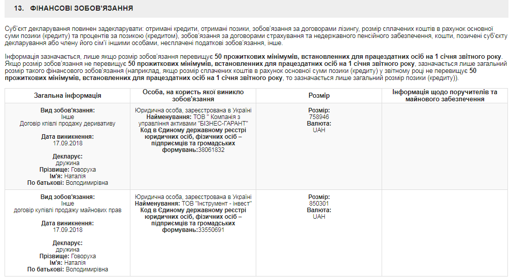 Новый глава ВСП сообщил в декларации, что его жена взяла на себя финансовые обязательства в сумме больше 1,5 млн. грн. 759 тысяч из них - по договору купли-продажи некоего дериватива в пользу компании по управлению активами (КУА) "Бизнес-гарант". Еще 850 тысяч обязательств оформлены на ООО "Инструмент-инвест" по договору купли-продажи не названных имущественных прав: