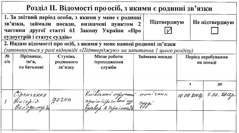 В декларации родственных связей на сайте ВСП Владимир Говоруха сообщил, что его другая дочь Виктория Сиренченко раньше работала помощником судьи в Киевском окружном админсуде: