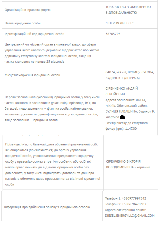 Так же точно зовут, согласно сведениям единого реестра юридических лиц, директора киевского ООО "Энергия Дизель". Учредитель этой фирмы - киевлянин с той же фамилией Сиренченко.