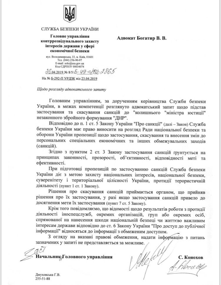 Его коллега Владимир Богатырь пошел дальше: он запросил на Банковой, в СБУ и у Совета нацбезопасности и обороны информацию о причинах, по которым спустя три года причисления Писаренко к "пособникам террористов" власти по-тихому "простили" его. Но вразумительного ответа так и не получил: аппарат СНБО уведомил юриста, что эти документы носят гриф "для служебного пользования".