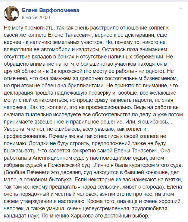"Что касается конкретно самой Елены Танасевич. Она работала в Апелляционном суде у нас помощником судьи, затем избрана судьей в Печенежский суд. Лично я была куратором этого суда (вообще, Печенеги это деревня, суд находится в бывшей конюшне, дел мало, в основном бытовуха. Если некоторые из вас намекают на взятки, так там их некому предлагать - народ сельский, живет с огорода). Елена очень порядочный и честный человек, взятки это не про нее, на этом своем утверждении я настаиваю. Кроме того, она еще и очень хороший человек, а также умница, очень целеустремленная, трудолюбивая, кандидат наук. По мнению Харькова это достойный выбор, - написала Варфоломеева. - Елена набрала больше всех баллов на квалифоценивании и является не липовым кандидатом наук. А опыта можно набраться и работая помощником судьи, были бы мозги, а с мозгами у нее не просто нормально, а просто шедеврально".