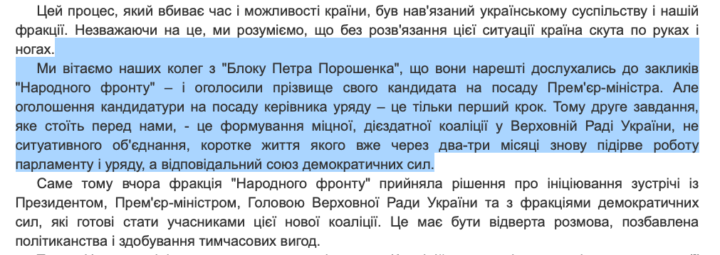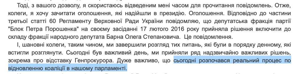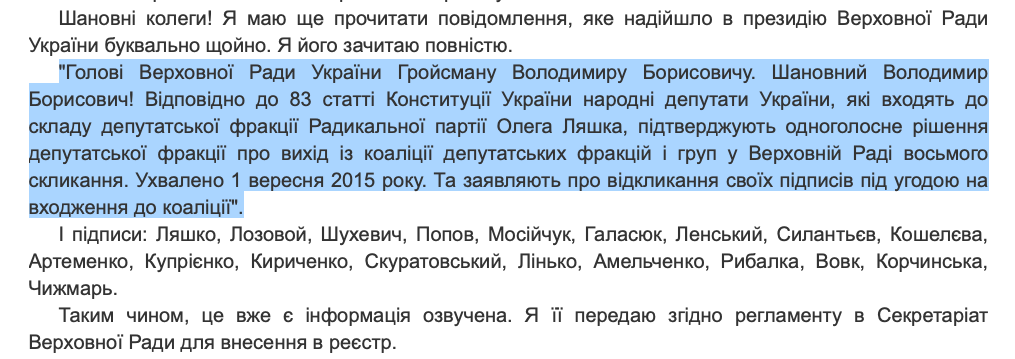 Во-первых, это заявление тогдашнего спикера Владимира Гройсмана, который зачитал обращение депутатов от Радикальной партии об их выходе из коалиции "Европейская Украина".