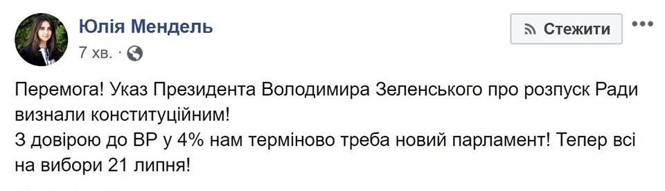 Между тем, этому решению КС, хоть пока и не обнародованному официально, уже обрадовались в Администрации Зеленского. Его спикер Юлия Мендель написала на Facebook радостный пост, который, впрочем, быстро удалила, дабы избежать обвинений в получении информации негласным путем и вмешательства в работу Конституционного суда.