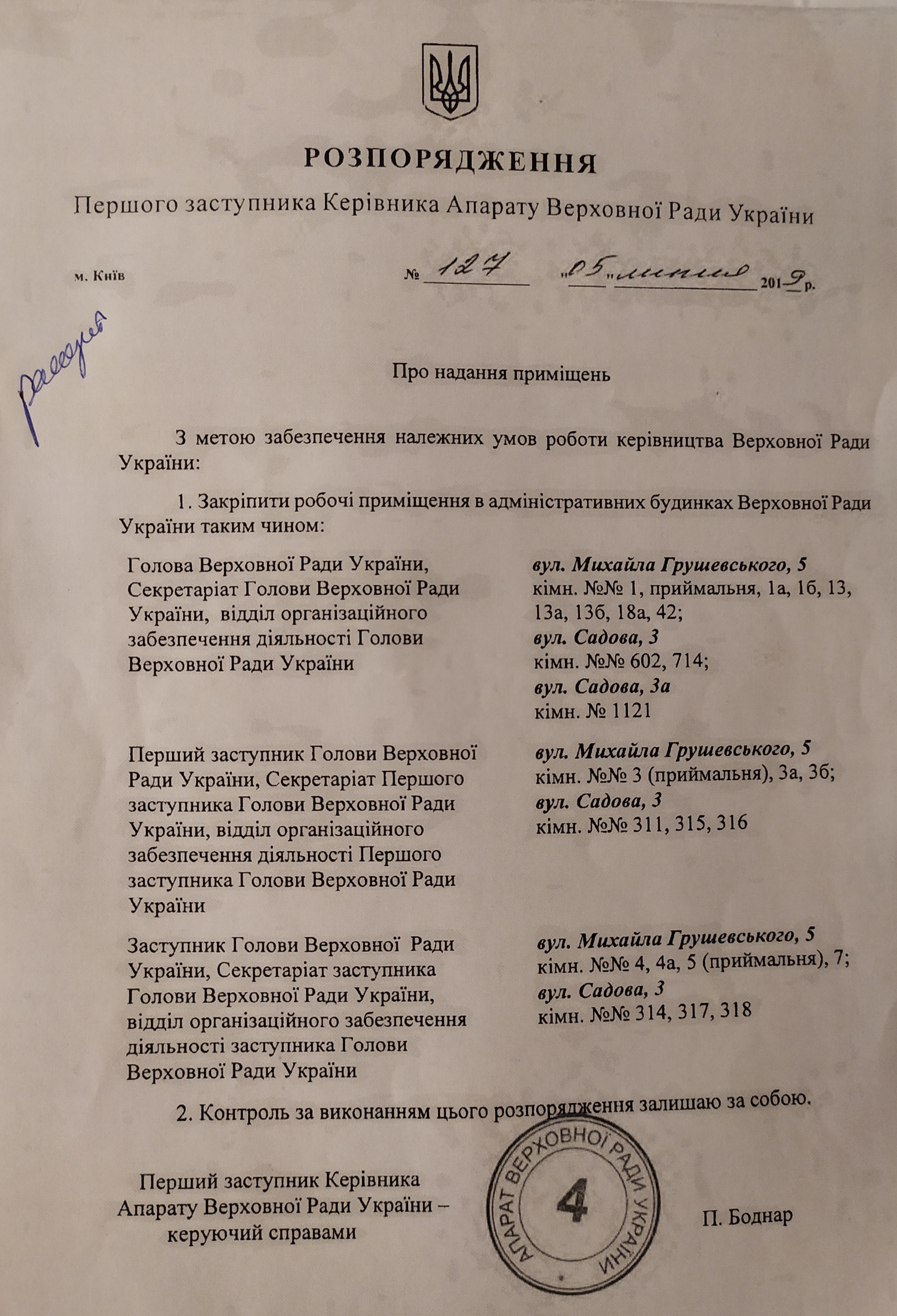 В работе с кадрами руководство аппарат Рады применяет и коллективный метод. Как свидетельствуют документы, по распоряжению управделами Бондара затеяли переезд отделов организационного обеспечения деятельности руководства парламента. Сейчас эти подразделения находятся в здании самой Верховной Рады по ул. Грушевского, 5. Однако решено переселить их в помещения парламентских комитетов по ул. Садовой.