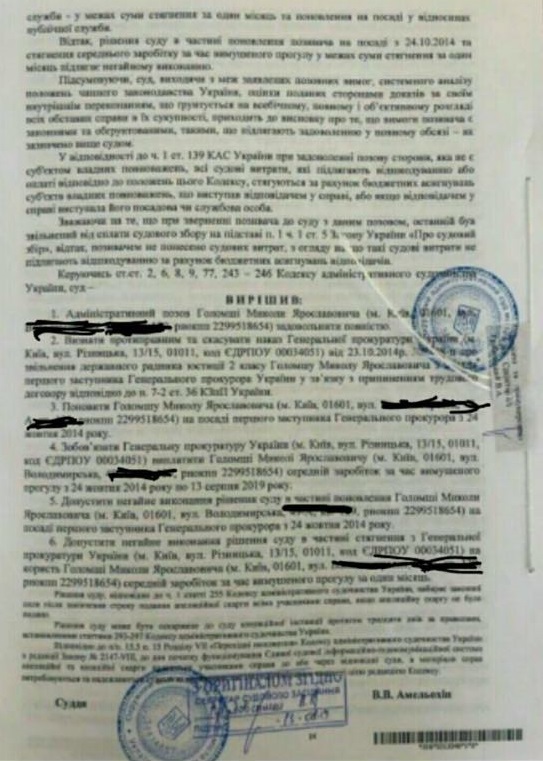 Суд посчитал, что истец не может быть привлечен к ответственности только в силу одного факта занятия им определенной должности при Януковиче. К тому же занимаемая Голомшей должность в ГПУ не была политической. Поэтому судья ОАСК решил, что не доказана и правомерность применения к истцу процедур, предусмотренных соответствующим законом. Это, в свою очередь, является достаточным и самостоятельным основанием для отмены решения об увольнении.