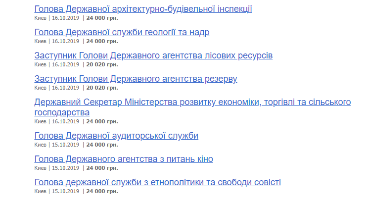 Например, любой желающий может отправить резюме на пост главы Госкино (должность вакантна после увольнения Филиппа Ильенко), главы Нацагентства по вопросам государственной службы (экс-глава Константин Ващенко стал госсекретарем Министерства финансов).