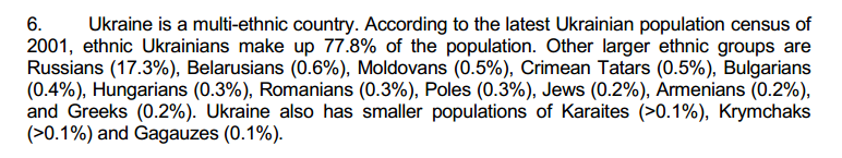 В своих выкладках в защиту русского и других языков Венецианская комиссия говорит о том, Украина - многонациональное государство. Комиссия ссылается на данные переписи населения Украины 2001 года. По ней этнические украинцы составляли 77,8% населения, а второй по численности этнической группой были русские (17,3%):
