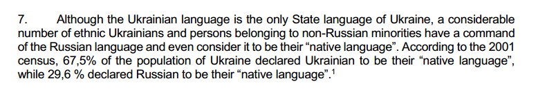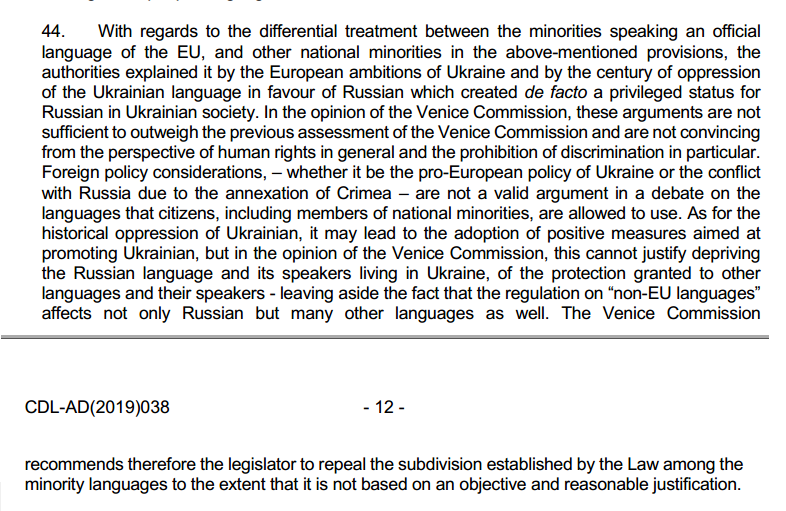 Что касается "исторического угнетения украинского языка", то это не может оправдать лишение русского языка и его носителей, проживающих в Украине, защиты, предоставляемой другим языкам и их носителям.