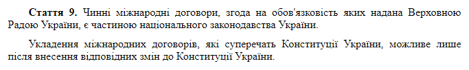 Все эти документы одобрены Верховной Радой. А согласно статье 9 Конституции Украины действующие международные договоры, согласие на обязательность которых дала Верховная Рада, являются частью национального законодательства Украины: