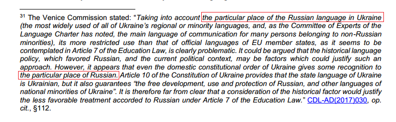 Венецианская комиссия очень жестко тогда заявляла: "Принимая во внимание особое место русского языка в Украине (наиболее широко используемый из всех региональных языков Украины или языков меньшинств, и, как отметил Комитет экспертов Хартии языков, основным языком общения для многих лиц, принадлежащих к нерусским меньшинствам), его более ограниченное использование, чем официальных языков государств-членов ЕС, как это предусмотрено в статье 7 Закона об образовании, явно проблематично.