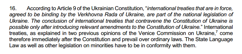 Более того, Венецианская комиссия разъяснила, что международные договоры по юридической силе идут сразу после Конституции и имеют преимущество перед обычными законами. А это значит, что Закон о госязыке и другие законы о правах меньшинств должны соответствовать этим международным договорам: