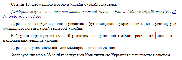 Венецианская комиссия считает статью 10 Конституции ключевым положением с точки зрения защиты языковых прав и свобод. В ней русский язык выделен отдельно, и ему гарантируется свободное развитие, использование и защита, наряду с другими языками национальных меньшинств Украины: