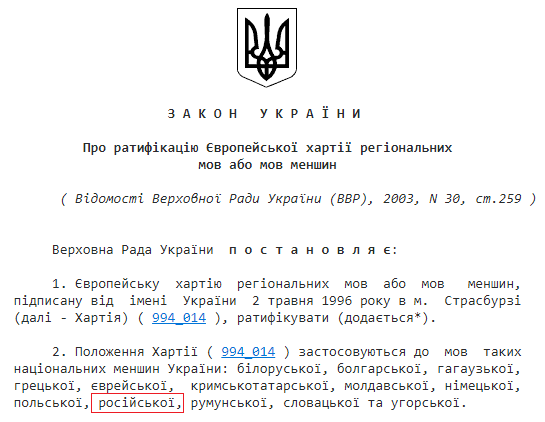 Русский язык подлежит защите в Украине как один из региональных языков или языков меньшинств. Ведь в законе о ратификации Языковой хартии Украина указала, что будет применять эту Хартию к следующим языкам: белорусский, болгарский, гагаузский, греческий, еврейский, крымскотатарский, молдавский, немецкий, польский, русский, румынский, словацкий и венгерский:
