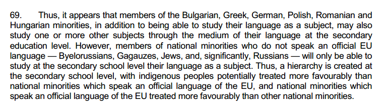 В результате, как считает Венецианская комиссия, носители языков ЕС - болгарского, греческого, немецкого, польского, румынского и венгерского - могут изучать предметы в средней школе на своем языке.