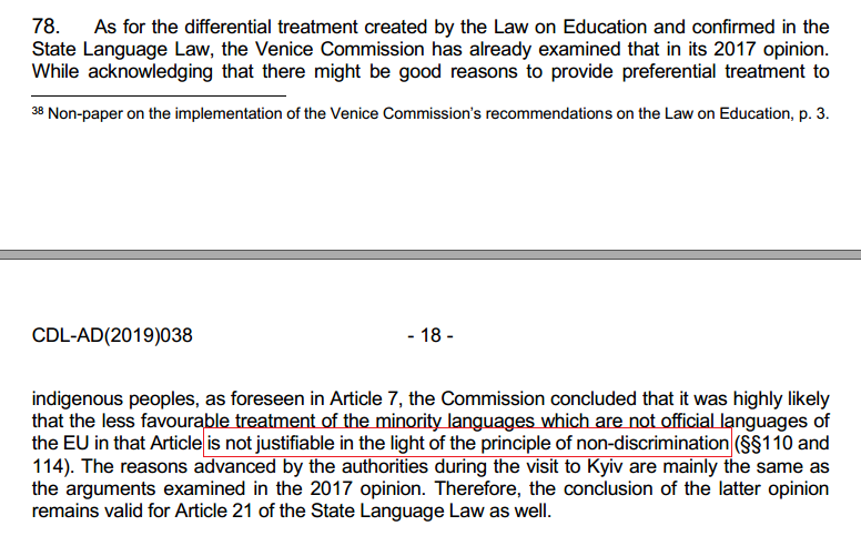 Как сообщала "Страна", замминистра культуры Анатолий Максимчук заявлял, что никаких обвинений в дискриминации Венецианская комиссия не выдвигала, а попросила лишь обосновать такой подход. Однако из полного текста документа видно, что это не так.