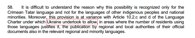 Комиссию это удивило. Она пишет: "Трудно понять причину, по которой такая возможность признается только для крымскотатарского языка, а не для языков других коренных народов и национальных меньшинств".