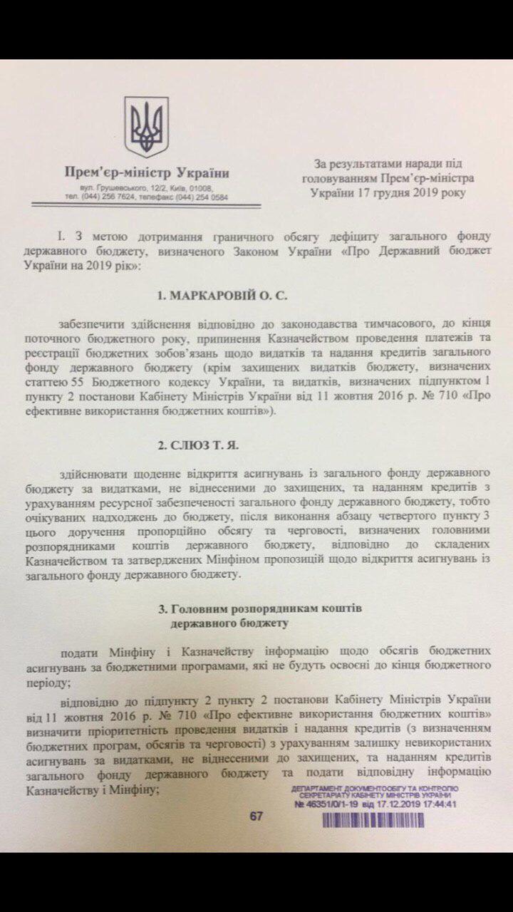 Распоряжение Алексея Гончарука. Фото: Telegram/Тёмный Рыцарь