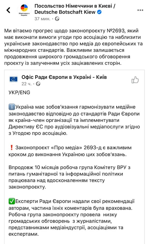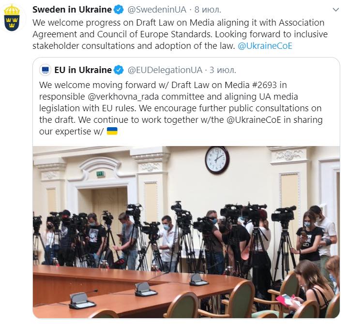 "Считаем очень важным воспользоваться позитивной динамикой и "окном возможностей", чтобы рассмотреть законопроект "О медиа" в первом чтении во время текущей сессии Верховной Рады Украины, - написала замглавы фракции "Слуга народа" Евгения Кравчук на своей странице в Facebook, тегнув для пущей убедительности Офис Совета Европы, канадское посольство, Посольство Германии в Киеве и Посольство Швеции.