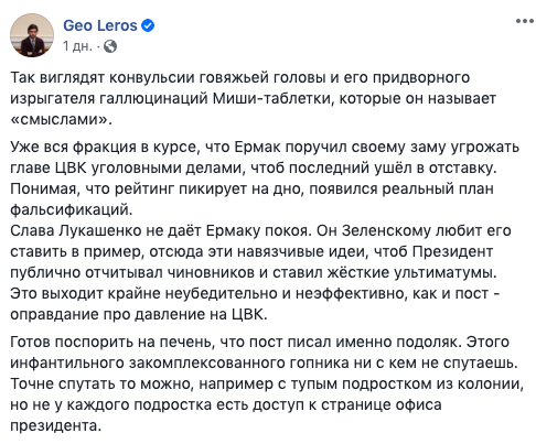 На это заявление Офиса президента отреагировал депутат от "Слуги народа" Гео Лерос (отметим, что у него самого конфликт с главой ОП Андреем Ермаком), который публично написал, что "уже вся фракция в курсе, что Ермак поручил своему заму угрожать главе ЦИК уголовными делами". Хоть Гео Лерос и не назвал имя заместителя прямо, очевидно, речь идет о Сергее Трофимове, который в ОП курирует региональную политику.