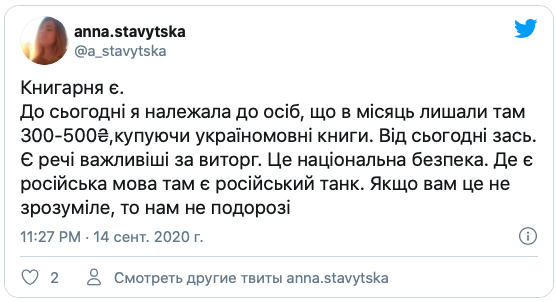 В защиту “Книгарні Є” выступил также журналист Вахтанг Кипиани. Он написал, что понимает решение магазинов продавать русскоязычные книги — для них это вопрос выживания.