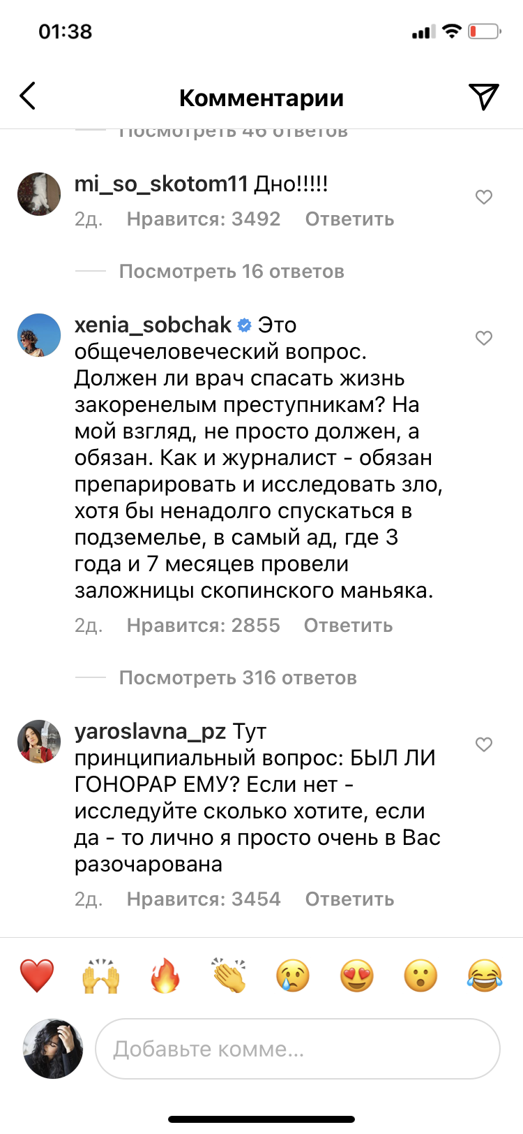 Сама Собчак после этого на своей странице в Инстаграме опубликовала пост, в котором заявила, что была готова к волне критики в свой адрес. Но она считает, что героями сюжетов необязательно должны быть только хорошие люди, а настоящий журналист, по ее мнению, смог бы пообщаться и с Гитлером.