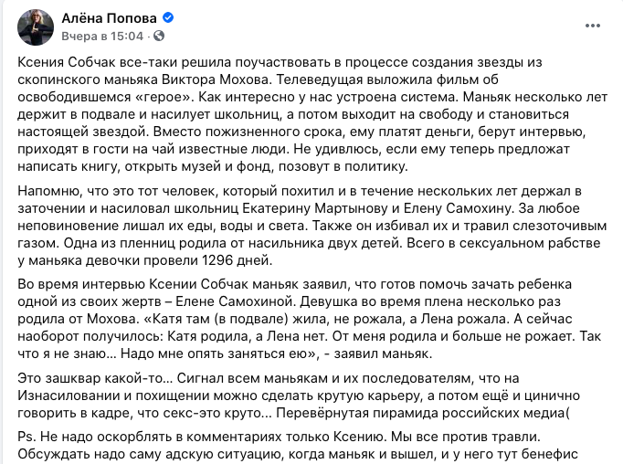 Телеведущая выложила фильм об освободившемся "герое". Как интересно у нас устроена система. Маньяк несколько лет держит в подвале и насилует школьниц, а потом выходит на свободу и становится настоящей звездой. Вместо пожизненного срока, ему платят деньги, берут интервью, приходят в гости на чай известные люди. Не удивлюсь, если ему теперь предложат написать книгу, открыть музей и фонд, позовут в политику… Это зашквар какой-то… Сигнал всем маньякам и их последователям, что на изнасиловании и похищении можно сделать крутую карьеру, а потом еще и цинично говорить в кадре, что секс – это круто... Перевернутая пирамида российских медиа", – отмечает Алена Попова.