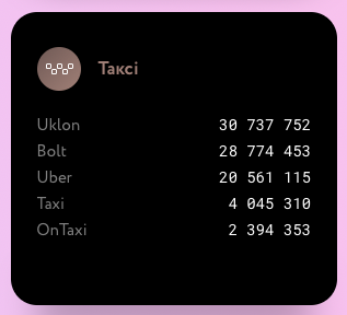 Согласно статистике Monobank, по сумме оплаченных поездок с карт пользователей этого банка лидирует Uklon. На втором месте - Bolt, на третьем - Uber.