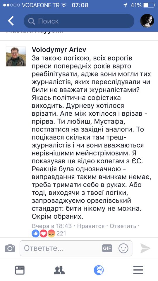 "Казалось бы обычная банальная ситуация. Но в действительности это индикатор маразма и абсурда, который воцарился в стране, потакаемый первыми лицами государства. Суть в том, что господин Филимоненко не журналист. Я не считаю правильным кого-либо бить, не уверен, что сам бы сдержался в той ситуации, но черт возьми, Филимоненко не журналист", - заявил Найем.