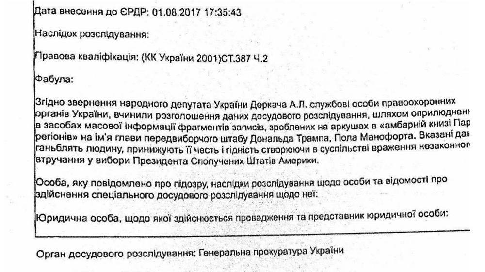 Фабула дела, внесенного в Единый реестр досудебных расследований, читается так, словно написана не следователем, а журналистом или блогером. Она гласит следующе: "должностные лица НАБУ совершили разглашение данных досудебного расследования путем обнародования в средствах массовой информации фрагментов записей "амбарной книги" Партии регионов на имя главы избирательного штаба кандидата в президенты США Дональда Трампа Пола Манафорта. Указанные действия позорят человека, унижают его честь и достоинство, создавая в обществе впечатление незаконного вмешательства в выборы президента Соединенных Штатов".
