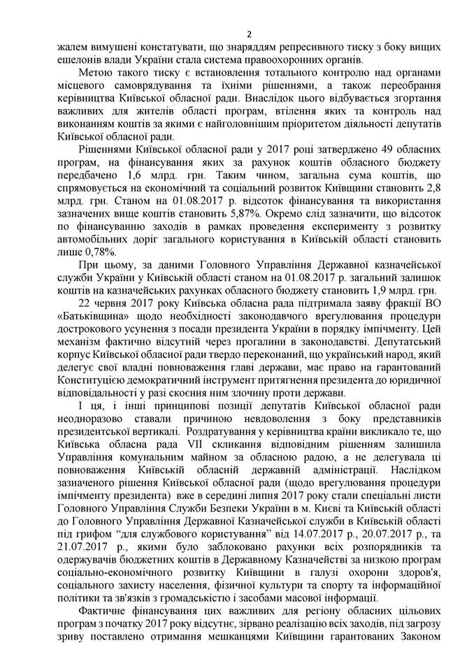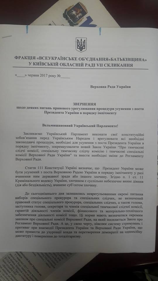 На сегодняшний день ряд депутатов Киевского облсовета от Блока Петра Порошенко обратились в суд с требованием признать противоправным и отменить обращение КОС к парламенту по теме импичмента.