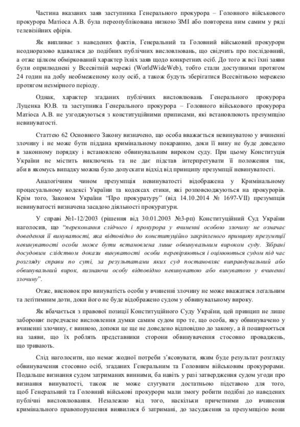 Как считают активисты, Луценко и Матиос нарушили закон о прокуратуре, размещая в соцсетях посты, в которых обвиняют в совершении преступления людей еще до вынесения приговора суда. Такие сообщения, как правило, набирают много лайков от экзальтированной сетевой публики, но нарушают один из основных принципов правосудия - презумпцию невиновности.