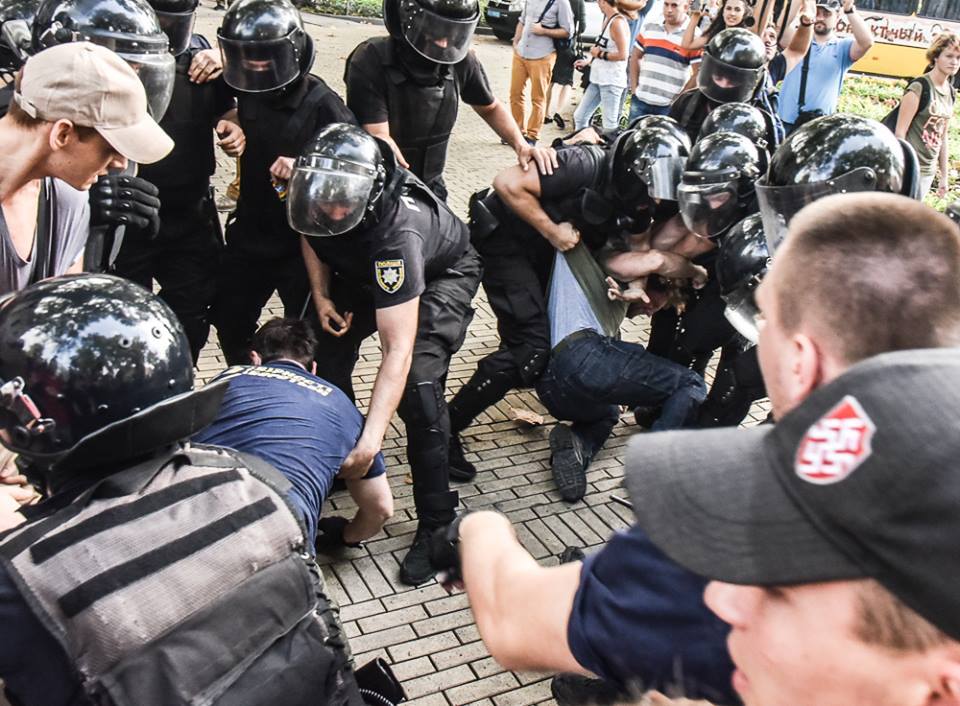 С "антимэрской" стороны выступают одесские "свободовцы", "С-14" и гражданский корпус "Азова", а также активисты из нескольких более мелких организаций.