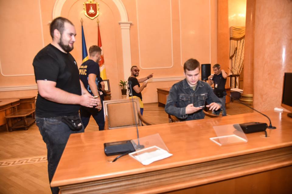 Подступы к мэрии были заблокированы тремя рядами нацгвардейцев и полицейских, а в коридорах здания горсовета дежурили группы муниципальной охраны и спортсменов-тай-боксеров (этим видом борьбы занимается сам мэр).