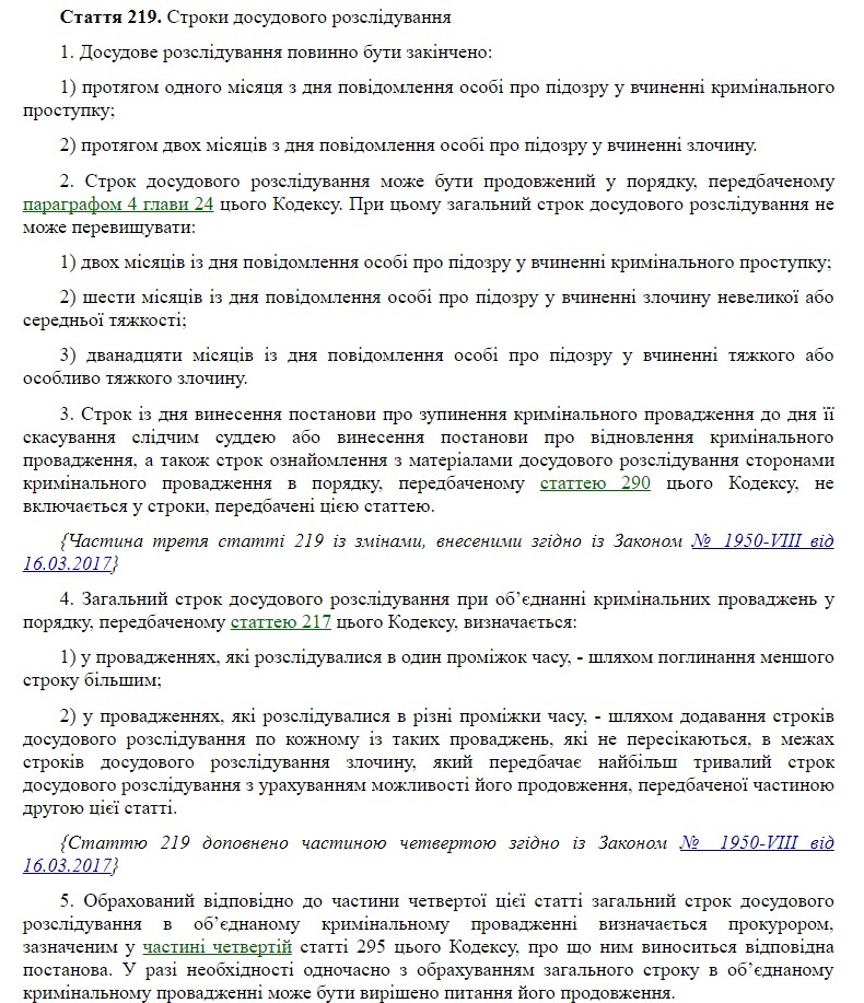 Для сравнения - действующими на сегодня нормами законодатель постановил отсчитывать срок досудебного расследования с момента объявления о подозрении.