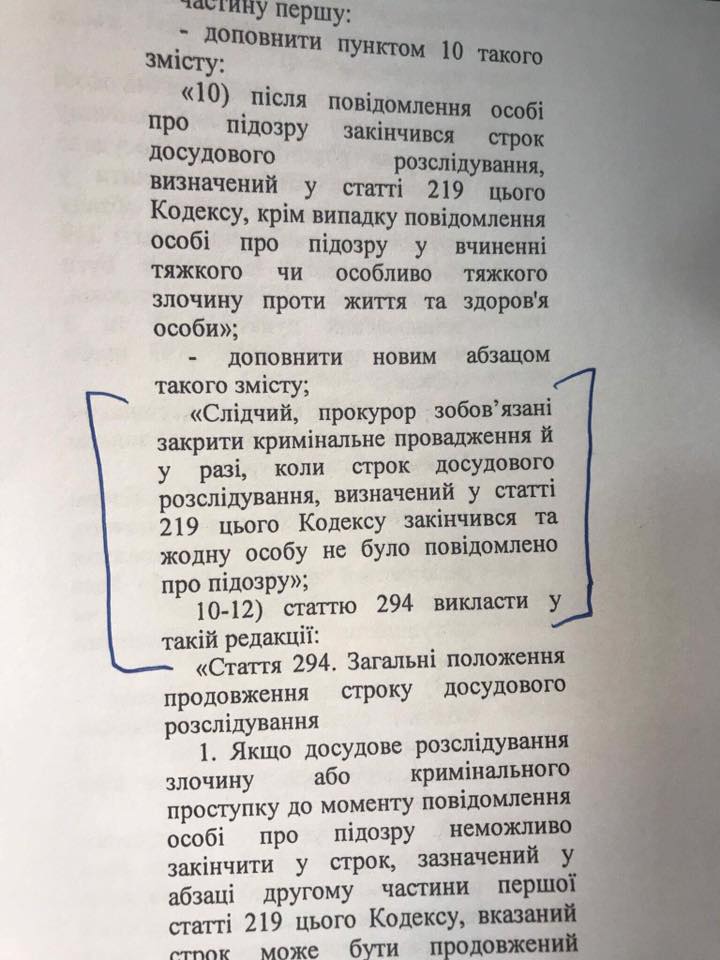 "Поскольку эта правка улучшает положение лица совершивших преступления, закон будет иметь обратную силу. При этом отсчет срока будет идти не с момента, когда преступнику вручают подозрение, а с момента регистрации производства. То есть, закрывать смогут, в том числе, уже открытые уголовные производства. Таким образом, Андрей Лозовой, подарил прокуратуре очень эффективный и простой инструмент торга со всем окружением Виктора Януковича касательно их преступлений и незаконно нажитого имущества", - считает нардеп Мустафа Найем.