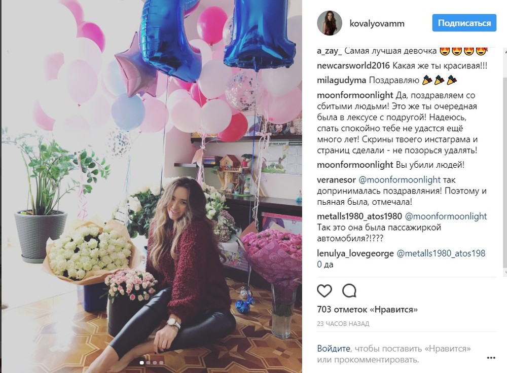 По информации источника "Страны" в полиции - вчера вечером в момент ДТП Зайцева ехала в Lexus'e не одна. С ней была подруга Марина Ковалева, страницу в Instagram которой уже атаковали озлобленные комментаторы.