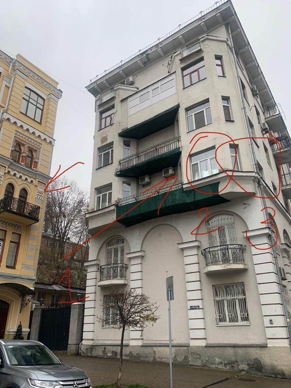1. Боковое окно жилого дома, в котором был обнаружен "телескоп". 2. Фасадные окна той же квартиры. 3. Продолжение той же квартиры. Отдельная стрелка указывает на желтый дом откуда сотрудник "Киевэнерго" увидел в окне соседнего дома "телескоп". Фото: "Страна"